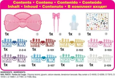 Tolle Fingernägel designen mit dem Aquabeads Disney Prinzessinnen Nagelstudio! Die Dekoteile werden aus der Schablone gelöst und auf den Basteltisch in Schleifenform gelegt. Dann steckt man die Schablone mit den Nägeln unter das Herz des Basteltischs. Mit den Stickern und den Dekoteilen werden die Nägel nun dekoriert und verziert. Die Dekoration haftet, indem man die Nägel mit Wasser bestreicht und die Teile anschließend darauf drückt. Sind die Fingernägel fertig geschmückt, werden sie von der Schablone gelöst. Die eigenen Fingernägel werden nun mit Wasser bestrichen und die dekorierten Fingernägel darauf befestigt. Die Nägel haften nur durch das Wasser, man benötigt keinen Klebstoff. Nach ca. fünf Minuten Wartezeit haften die bunten Nägel. Will man die Nägel entfernen, genügt nur ein leichtes Drücken und Schieben. Die Aquabeads Nägel sind mehrfach wiederverwendbar. Die Inhaltsstoffe der Aquabeads Nägel sind wasserlöslich und können sich beim Kontakt mit Wasser von den Fingern lösen. Im Aquabeads Disney Prinzessinnen Nagelstudio sind der Basteltisch, eine Pinzette, Fingernägel in acht Farben, ein Wasserfläschchen mit Pinsel zum Auftragen des Wassers auf die Nägel und zahlreiche Dekorationen und Sticker enthalten.