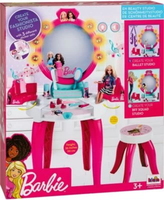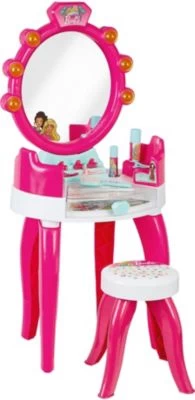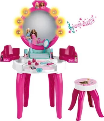 Aus dem Hause KLEIN kommt dieses BARBIE Schönheitsstudio, das aus einem Tisch mit Spiegel sowie einem Hocker besteht. Hier können sich kleine Prinzessinnen und Prinzen den ganzen Tag frisieren und Schmuck anprobieren. Dafür kommt das Set gleich mit praktischem Zubehör wie einem Kamm, einer Bürste sowie Haarclips, die natürlich alle hübsch gestaltet sind. Vor allem begeistert das tolle Schönheitsstudio aber mit den coolen Licht- und Soundfunktionen!