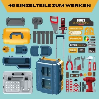 Werkbank mit Arbeitsplatte und Handwerks-Lernfunktion für Kinder 3 Nutzungsoptionen auf dem Boden, auf dem Tisch neben Papas Werkbank oder sogar als praktischer Koffer zum mitnehmen Maße stehend: L x B x H: ca. 60 x 27 x 74 cm Maße geschlossener Koffer: L x B x H: ca. 27 x 20 x 37 cm Werkzeug-Grundausstattung für den kleinen Handwerker: Schraubenschlüssel und -dreher, Hammer, Säge, Zange, Schraubstock, Sechskantschlüssel, Schrauben, Muttern und Verbindungsstücke Die Werkbank kommt zusammengebaut als Koffer und muss nur per Selbstmontage anhand der beiliegenden Montageanleitung in die verschiedenen Nutzungsoptionen versetzt werden