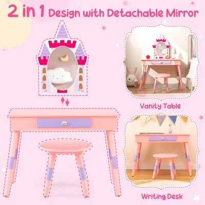 Dieses entzückende Schminkset mit Schlossmotiv ist ein perfektes Geschenk für Ihre kleine Prinzessin! Der Schminktisch mit abnehmbarem Spiegel erleichtert den Kindern das Schminken und dient gleichzeitig als Schreibtisch. Außerdem verfügt der Schminktisch über eine große Schublade zur Aufbewahrung von Schmuck, Beauty-Accessoires usw. Ihres Kindes. Ein zusätzliches Höhenlineal, drei Wandablagen, drei Haken und ein Türschild sind ebenfalls enthalten.