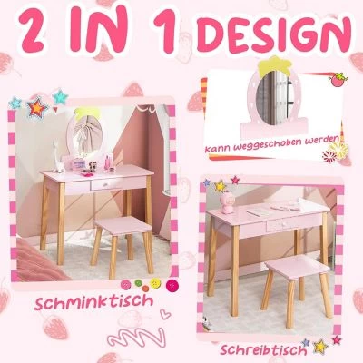 Machen Sie Ihrer kleinen Prinzessin mit diesem 2-in-1-Schminktischset für Kinder ein perfektes Geschenk! Und der Spiegel kann für eine Umwandlung zum Lerntisch wegbewegt werden. Die große Tischplatte und die praktische Schublade bieten viel Stauraum für Kindersachen. Der durchdachte Hocker ist im Lieferumfang enthalten, um Kindern eine Sitzgelegenheit zu bieten. Mädchen werden dieses Kinder-Kosmetiktischset mit einem erdbeerförmigen Spiegel bevorzugen.