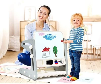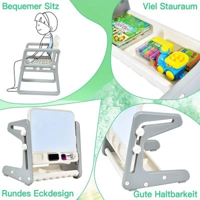 Unser Kinder-Zeichenbrett mit Stuhl wird dauerhaft Freude bereiten und Ihre Kinder durch ihre Kindheit begleiten. Dieses 2-in-1-Kindermalbrett mit Stuhl kann zudem als Tisch verwendet werden, und Sie können es im Winkel verstellen, um es zu einem Zeichenbrett zu machen. Sowohl die Tischplatte als auch die Unterseite des Tisches sind mit Einkerbungen versehen, sodass Ihr Kind genügend Platz hat, um darin Marker, Radiergummi, Spielzeug und andere Kleinigkeiten aufzubewahren. Das geruchlose HDPE-Material und die abgerundeten Ecken dienen der Sicherheit Ihres Kindes. Die bequeme Rückenlehne stützt den Körper des Kindes. Untersetzer verhindern effektiv, dass der Boden zerkratzt wird. Der Tisch lässt sich mit nur wenigen Handgriffen aufstellen, wodurch Sie Zeit und Energie sparen.