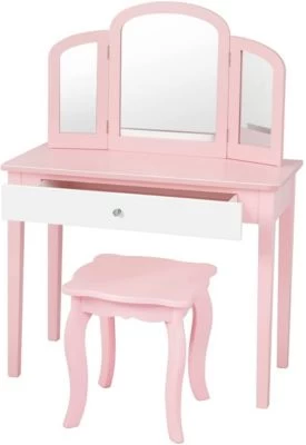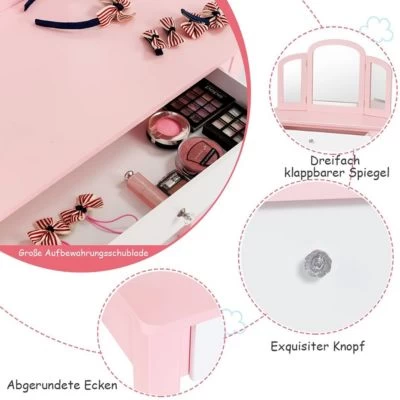 Unser Set umfasst einen Frisiertisch mit Spiegel und einen Hocker. Der Spiegel ist dreifach klappbar und daher überaus praktisch. Er kann jedoch auch abgenommen werden, wenn der Tisch als Schreibtisch verwendet werden soll. Eine Schublade bietet Stauraum für Kleinigkeiten wie Makeup, Bürsten, Schmuck usw. Aus hochwertigen MDF-Platten und Kiefernholz gefertigt sind Tisch und Stuhl sehr robust und tragfähig. Zögern Sie nicht länger und überraschen Sie Ihren kleinen Liebling mit diesem tollen Set!