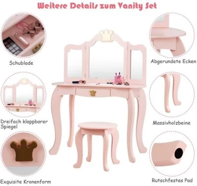 Dieser kinder Schminktisch ist das perfekte Geschenk für Ihr kleines Mädchen. Das Schminktisch Set ist EPA Getestet und die Farben, die wir verwendet haben sind bleifrei, wobei sie gleichzeitig geruchlos sind. Hergestellt aus hochwertigen, verdichteten Brettern, ist das gesamte Schminktisch Set sehr stabil und kann über einen langen Zeitraum hinweg verwendet werden. Der enthaltene dreifach Klappbare Spiegel sorgt dafür, dass Ihre Kleine den Winkel des Spiegels nach Belieben verstellen kann um so mehr Licht zu bekommen, um die Schminke aufzutragen. Die Ankleide besitzt ebenfalls eine Schublade, um kleine Gegenstände, so wie Haargummis, Bürsten, Schminke, Nagellack und anderen spaßigen Krimskrams zu verwahren. Zusätzlich kann der Spiegel entfernt werden und der Tisch somit auch zum Schreiben und Lesen verwendet werden.