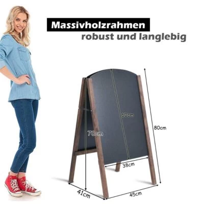 Unser doppelseitiger beschriftbarer Kundenstopper aus lackiertem Holz ist für Innen- und Außenbereich einsetzbar, ideal für ein Menü oder für Werbebotschaften Ihres Geschäftes, Pubs oder Cafés. Die Oberfläche dank der hochwertiger Verarbeitung ist sehr robust, abriebfest und leicht zu reinigen. Der Stopper ist solide gebaut und zwei Tafeln sind mit Scharnieren verbunden, ist sehr stabil und lasst sich schnell zusammenfalten.