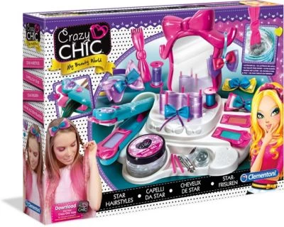 Dieses Schönheitsset der Marke Clementoni wird Ihnen helfen die schönsten Frisuren zu kreieren. Im Set enthalten ist ein Spiegel, eine Haar-Farbpalette und bunte Kreidetäfelchen, um unterschiedliche Farben zu erschaffen. Weiterhin sind Clips und eine Accessoire-Ablage enthalten. Durch die Mulden in der Ablage können ganz einfach Schleifen hergestellt werden, die an die Clips oder an den Haarbändern befestigt werden können. Das Set stimuliert das handwerkliche Geschick bei Kindern.