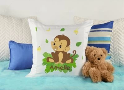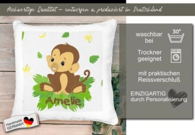 Das Kissen ist mit einer Federfüllung gefüllt und wird mit einem liebevoll gestalteten Motiv und dem Namen eures Kindes personalisiert.