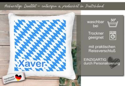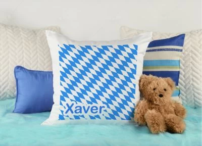 Das Kissen ist mit einer Federfüllung gefüllt und wird mit einem liebevoll gestalteten Motiv und dem Namen eures Kindes personalisiert.