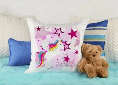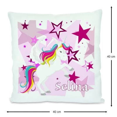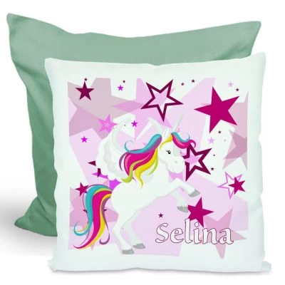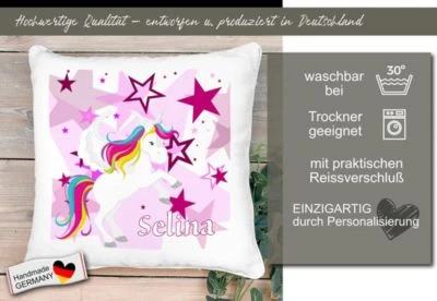 Das Kissen ist mit einer Federfüllung gefüllt und wird mit einem liebevoll gestalteten Motiv und dem Namen eures Kindes personalisiert.