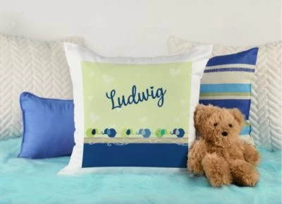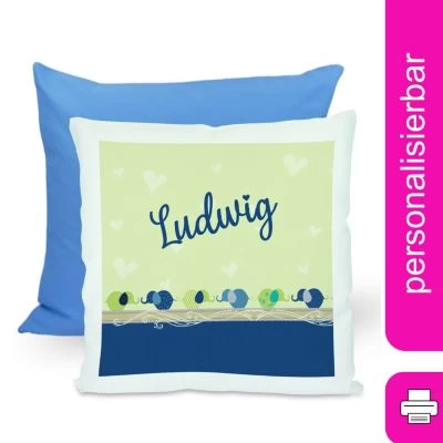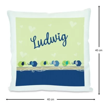 Das Kissen ist mit einer Federfüllung gefüllt und wird mit einem liebevoll gestalteten Motiv und dem Namen eures Kindes personalisiert.