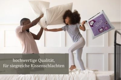 Das Kissen ist mit einer Federfüllung gefüllt und wird mit einem liebevoll gestalteten Motiv und dem Namen eures Kindes personalisiert.