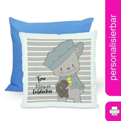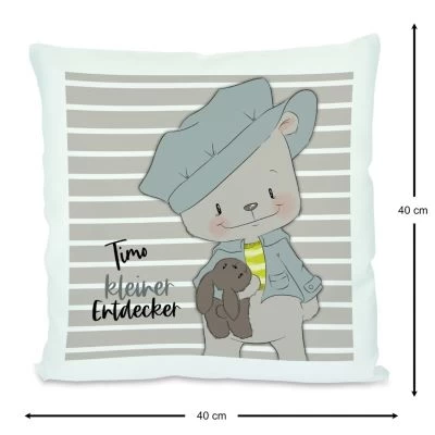 Das Kissen ist mit einer Federfüllung gefüllt und wird mit einem liebevoll gestalteten Motiv und dem Namen eures Kindes personalisiert.