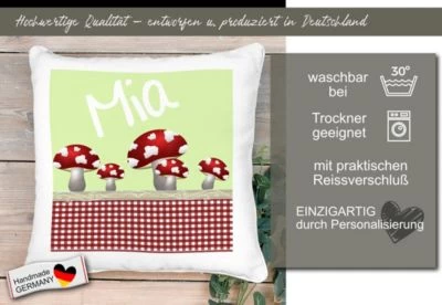 Das Kissen ist mit einer Federfüllung gefüllt und wird mit einem liebevoll gestalteten Motiv und dem Namen eures Kindes personalisiert.