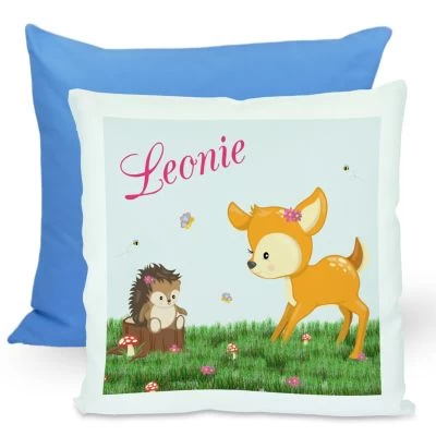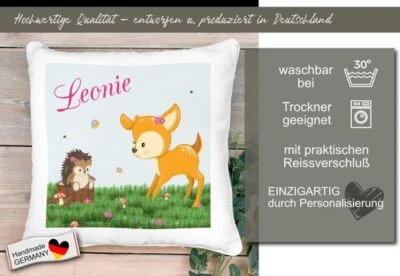 Das Kissen ist mit einer Federfüllung gefüllt und wird mit einem liebevoll gestalteten Motiv und dem Namen eures Kindes personalisiert.