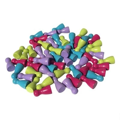 60 kleine Halmakegel / Spielkegel aus Holz, poliert Lieferumfang: 1 x Polybeutel mit Druckverschluss zur Aufbewahrung Farben: je 15 x Fuchsia, Lemon, Flieder,Türkis Maße Kegel: 24 x 12 mm