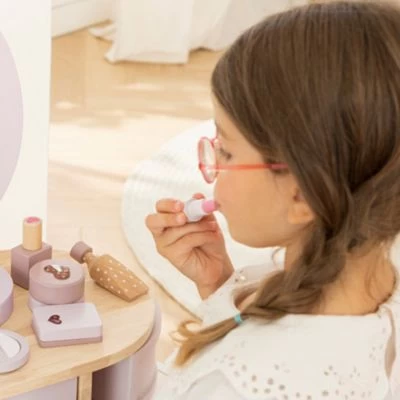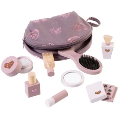• gefüllt mit 8 Holzteilen wie Lippenstift, Puder, Lidschatten, Make-up Tube, Nagellack, Parfüm, Haarbürste und Handspiegel