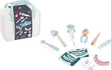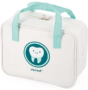 Dieses tolle Zahnarzt-Set aus dem Hause Janod kommt in einem praktischen Köfferchen und eignet sich klasse, um einen Zahnarztbesuch und die Zahnpflege nachspielen. Mit der Zahnbürste, der Zahnpasta, der Spritze, dem Spiegel und weiterem Zubehör können die acht herausnehmbaren Zähne der Prothese optimal untersucht und gereinigt werden. Ein tolles Geschenk, das Kinder zur Zahnpflege motiviert.