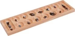 Kalaha, im englischen Sprachraum Kalah genannt, ist ein modernes Strategiespiel der Mancala-Familie (von arab.: naqalah = bewegen) für zwei Spieler. Das myToys-COLLECTION Kalaha von Vedes hat einfache Regeln, aber viele taktische Möglichkeiten für spannende Partien. Das Spielbrett besteht aus zwei Muldenreihen mit jeweils sechs Spielmulden. Außerdem befindet sich an jedem Ende eine größere Gewinnmulde, auch Kalah genannt, welche im Laufe der Partie die gefangenen Spielsteine aufnimmt. Jedem Spieler gehören die sechs Spielmulden auf seiner Seite des Brettes und die rechts von ihm gelegene Gewinnmulde. Die Runden der Spieler bestehen darin, die Steine in den Mulden zu bewegen. Wenn ein Spieler an der Reihe ist, wählt er eine seiner Spielmulden, nimmt ihren Inhalt und verteilt ihn gegen den Uhrzeigersinn in die darauffolgenden Mulden. Dabei wird in jede Mulde, außer in die gegnerische Gewinnmulde, ein Stein gelegt.
