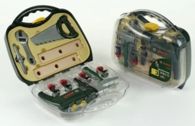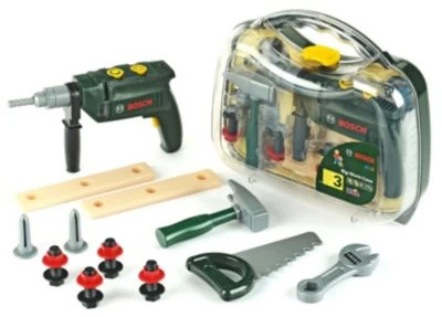 Ganz nach großem Vorbild wurde der große Bosch-Werkzeugkoffer mit allem ausgestattet, was kleine Heimwerker*innen brauchen! Mit Bohrmaschine, Säge, Hammer, Nägeln und Schrauben kann stundenlang gewerkelt werden. Die batteriebetriebene BOSCH-Bohrmaschine erzeugt ein realistisches Bohrgeräusch mit rotierendem Bohrer.