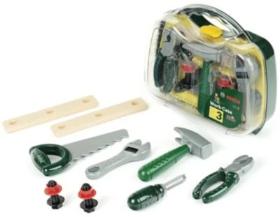 Der Bosch Werkzeugkoffer für die kleinsten Handwerker ist gefüllt mit ungefährlichem Werkzeug aus Kunststoff.