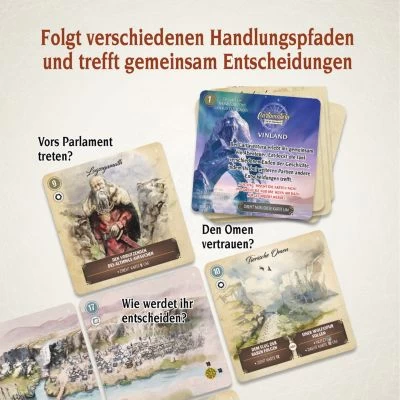Unterwegs mit einem berühmten Wikinger! Auf den Spuren von Erik dem Roten bewegen sich die Spielerinnen und Spieler in diesem Abenteuerspiel. Das Team aus 1-6 Personen startet im Jahr 1000 auf eine Reise, die sie von Island, über Grönland bis nach Amerika führt. Schnell die beiden Regelkarten lesen und schon starten alle gemeinsam in ein Abenteuer ins Ungewisse! Einige Karten zeigen Orte, an denen sie vorbeikommen, andere Karten stellen sie vor Entscheidungen. Welcher Weg ist der richtige in diesem Kartenspiel? Während sich die Geschichte mit jeder Karte weiterentwickelt, kommen die Spielerinnen und Spieler einem der fünf möglichen Enden immer näher. Auf ins Abenteuer!