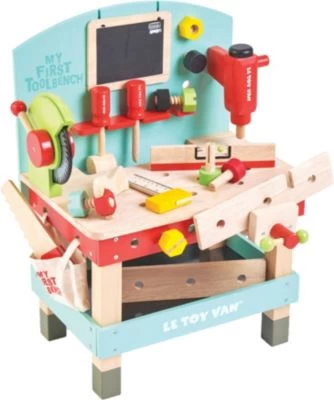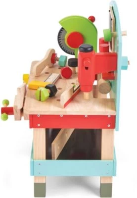 Eine erste hölzerne Werkzeugbank mit 20 Teilen. Sie enthält Elektrowerkzeuge wie Bohrer und Kreissäge, außerdem einen Schraubstock, eine Säge, einen Hammer, einen Schraubendreher, eine Wasserwaage, ein rechtwinkliges Lineal, einen Schraubenschlüssel und eine Tafel. Dazu ein praktisches Ablagefach und zwei Bretter mit Schrauben und Muttern.