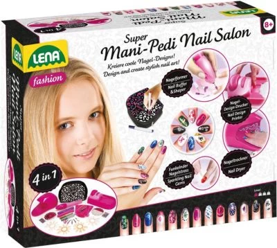 Der Mani-Pedi Nail Salon bietet viele Möglichkeiten in einer Faltschachtel. Das 4 in 1 Set beinhaltet einen Nagelformer mit 5 verschiedenen Aufsätzen. Mit dem Nagel-Design-Drucker können mit 48 verschiedenen Motiven und funkelnden Nagelstrass aufgehübscht werden. Der dazugehörige Nageltrockner trocknet die Nägel im Handzmdrehen, sodass die Nägel schnell gezeigt werden können.