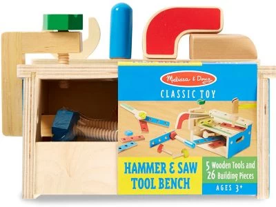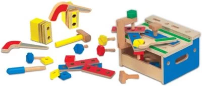 Die Melissa & Doug Werkbank aus Holz mit Hammer und Säge kommt mit viel Zubehör! Zu den 32 Teilen dieses Holzbaukastens gehören Nägel zum Einschlagen mit dem Hammer, Schrauben zum Drehen mit dem Schraubendreher und Platten zum Verbinden und Auseinandersägen. Das Beste daran: Die Werkzeuge und das Baumaterial lassen sich in einer kompakten Holzwerkbank mit Messfläche und C-Klemme verstauen! Kleine Baumeister*innen können den beiliegenden „Bauplänen“ folgen, um ein Tier, ein Haus, einen Roboter oder ein Boot zu bauen. Natürliche können auch eigene fantasievolle Strukturen kreiert werden!