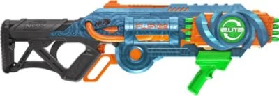 Der Nerf Elite 2.0 Flipshots Flip-32 Blaster sorgt für actionreiche Battles! Der Blaster hat 32 Läufe – 16 zeigen nach vorne und 16 nach hinten. Es können Darts aus den 16 nach vorne zeigenden Läufen abgefeuert werden, anschließend können die 16 nach hinten zeigenden Läufe vorgeklappt werden, um weiterzufeuern. Wenn die Mitspielenden denken, die Läufe seien leer, können sie so mit 16 weiteren geladenen Läufen überrascht werden. Die in unterschiedliche Richtungen zeigenden Läufe sind miteinander verbunden, sodass sie einfach gedreht werden können, indem am Griff gezogen wird. Es können ein oder zwei Darts auf einmal abgefeuert werden. Der Abzug wird bis zur Hälfte gedrückt, um einen Dart abzufeuern oder es werden zwei Darts auf einmal abgefeuert, indem der Abzug bis zum Anschlag gedrückt wird. Der Blaster bietet Hebel-Action. Jeder Lauf enthält einen Dart, sodass der Blaster eine Kapazität von 32 Darts hat. Ein Augenschutz wird empfohlen (nicht enthalten).