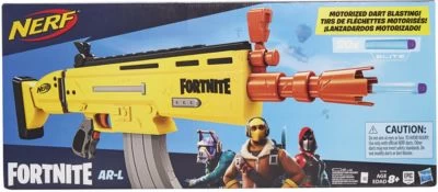 Der Nerf Fortnite AR-L Blaster hat den in Fortnite verwendeten Blaster zum Vorbild und dasselbe Aussehen und dieselben Farben wie der Blaster im beliebten Videospiel. Dieser Nerf Elite Blaster mit motorisiertem Dart-Abschuss lädt dazu ein, Fortnite im echten Leben nachzuspielen. Der Motor wird mit dem Beschleunigungs-Knopf gestartet und durch das Betätigen des Abzuges wird ein Dart abgefeuert.