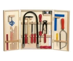 Laubsäge, Laubsägetischchen mit Einspannhalterung aus Holz, Zwinge, Laubsägeblätter, Laubsägeschlüssel, Ahle, Flachfeile, Rundfeile, großer Schraubendreher (Schlitz), kleiner Schraubendreher (Schlitz), Stahlhammer, Beißzange, Drillbohrer, Säge für Metall mit Holzgriff, Schleifböckchen, Winkel, Lineal, Gebrauchsanweisung