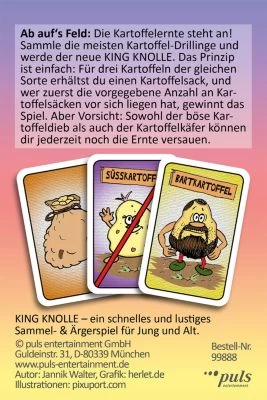 Ab auf’s Feld: Die Kartoffelernte steht an! Sammle die meisten Kartoffel-Drillinge und werde der neue KING KNOLLE. Das Prinzip ist einfach: Für drei Kartoffeln der gleichen Sorte erhältst du einen Kartoffelsack. Und wer zuerst die vorgegebene Anzahl an Kartoffelsäcken vor sich liegen hat, gewinnt das Spiel. Aber Vorsicht: Sowohl der böse Kartoffeldieb als auch der Kartoffelkäfer können dir jederzeit noch die Ernte versauen… KING KNOLLE – ein schnelles und lustiges Sammel- & Ärgerspiel für Jung und Alt.