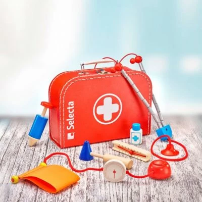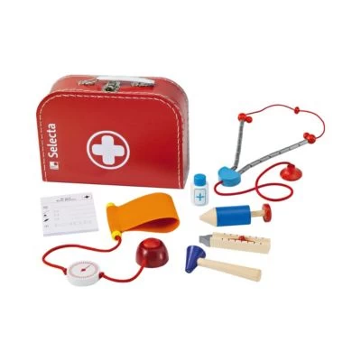 Läuft die Nase oder kratzt der Hals? Dann nichts wie ab zum Mini-Arzt! Dieser hat in seinem Arztkoffer alles dabei, was kleine Patienten wieder gesund macht. 8-teiliges Arztkoffer-Set von Selecta ab 36 Monaten Maße Koffer: 25(L) x 18(B) cm Made in Germany Stethoskop, Blutdruckmessgerät, Spritze, Thermometer, Medizinfläschchen und Otoskop sind im Arztkoffer von Selecta stets gut aufbewahrt. Die Accessoires sind aus robustem Holz gefertigt. Der kleine Arzt kann sogar Rezepte ausstellen und den Blutdruck messen. Im Koffer ist alles schnell verstaut und bereit für den nächsten Einsatz.