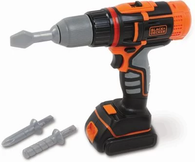 Der beste Freund kleiner Nachwuchs-Handwerker – der praktische Akkuschrauber Black+Decker von Smoby verfügt über drei Aufsätze: Er kann als Stahl- und Holzbohrmaschine und als Akkuschrauber verwendet werden. Black+Decker Akkuschrauber von Smoby 3 Aufsätze: Kreuz, Schlitz, Bohrer, 2-Gang Getriebe, Rechts- und Links- Lauf, abnehmbares Batteriegehäuse, inkl. Batterie (2 x 1,5 V LR06 AA) Lichteffekte aus robustem Kunststoff ab 3 Jahren geeignet Mit dem Akkuschrauber können Technik-Tüftler sich so richtig austoben. Dank der drei Aufsätze ist das Werkzeug Stahl- und Holzbohrmaschine und kann als praktischer Akkuschrauber eingesetzt werden. Ob Schrauben, Entschrauben oder Bohren – hier geht einfach alles. Das Modell ist eine detailgenaue Nachbildung des großen Originals von Black+Decker. Er ist mit einem Zwei-Gang-Getriebe ausgestattet. Die hohe Drehzahl ist dabei zum Bohren, die niedrige Drehzahl für kontrollierte Schraubarbeiten geeignet. Der Nachwuchs kann zwischen Rechts- und Links-Lauf zum Ein- oder Ausschrauben wählen. Der Clou: Beim Schrauben leuchtet der blaue Ring auf, was das Spiel noch authentischer gestaltet. Die drei Aufsatzspitzen Kreuz, Schlitz und Bohrer können von Kids kinderleicht und im Nu ausgewechselt werden. Das Batteriegehäuse ist abnehmbar. Das Produkt ist aus robustem Kunststoff hergestellt und für Kinder ab drei Jahren geeignet.