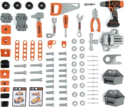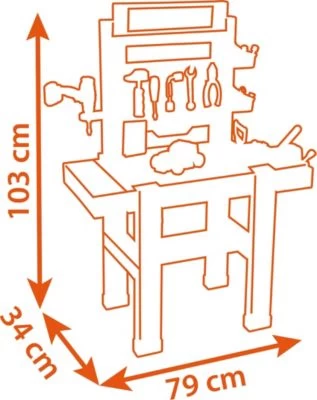 Das große Werkbank Center von Smoby sieht aus wie eine echte Werkbank. Mit ihr können die Kleinen spielerisch die Handwerkswelt erkunden und die verschiedenen Werkzeuge kennenlernen. Die große Arbeitsfläche in Holzstruktur bietet jede Menge Platz für unterschiedliche Werkzeuge. Mit dem Akkuschrauber lassen sich aus den Konstruktions-Bausteinen verschiedene Fahrzeuge zusammenschrauben. Abgerundet wird die Ausstattung durch eine Schraubzwinge und ein verschiebbares Lineal. Zudem gibt es viele Ablagefächer für Schrauben und Nägel.