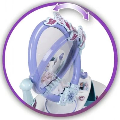 Mit dem Smoby „Die Eiskönigin“-Frisiersalon sind der Fantasie keine Grenzen gesetzt! Auf dem bequemen Sitz kann man mit Freund*innen und Geschwistern Platz nehmen und sich frisieren und stylen. Der stabile Schminktisch mit dem großen, schwenkbaren Spiegel ist ganz in den Lieblingsfarben der Eiskönigin Elsa und ihrer Schwester Anna gestaltet. Parfümfläschchen, ein Kamm, ein Haarreif, ein Halsreif, ein Haarkämmchen, Armreif und drei Ringe liegen schon für die kleinen Eiskönigin-Fans bereit. Praktisch sind die zahlreichen Ablageflächen, in denen sich prima alle Accessoires aufbewahren lassen.