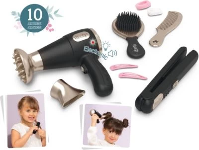 Dieses „My Beauty“-Frisierset aus dem Hause Smoby sorgt mit der realistischen Verarbeitung sowie den Sound- und Lichteffekten für tollen Spielspaß. Es eignet sich ideal zum Ausprobieren eigener Haarstyles, ohne dabei Wärme zu erzeugen. Neben dem Fön enthält das Set unter anderem auch ein Glätteisen, eine Bürste, einen Kamm und weiteres Zubehör.