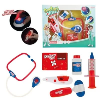 Mit diesem Arzt-Set bist du der beste Arzt der Welt.Das Stethoskop mit Ton und Licht, Spritze, Reflex-Hammer, Pflasterpackung , Salbendose.