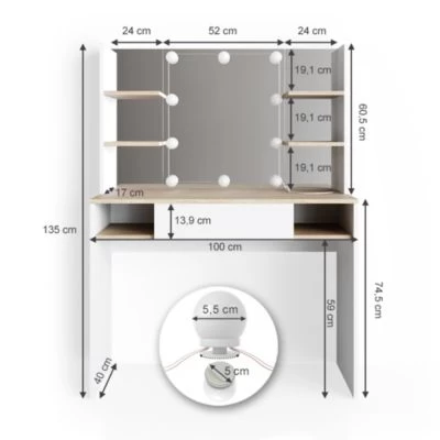 Schminktisch: 99 x 133,4 x 40,1 cm (BxHxT)