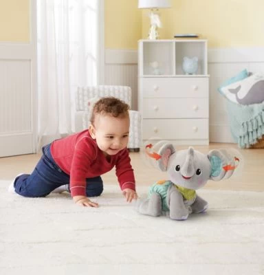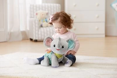Der süße Plüschelefant von Vtech animiert die Kleinen zum Krabbeln und Spielen. Stoffspielzeug Krabbel-mit-mir-Elefant von Vtech 3 Krabbelprogramme mit Lernschwerpunkten Zählen, Sprechen und Singen aufleuchtende Sterntaste, 3 bunte Tasten, 3 gesungene Kinderlieder und 15 Melodien deutschsprachig Lautstärkeregler, kindersicheres Batteriefach, Abschaltautomatik inkl. Demobatterien (3 x AA) ab 9 Monaten geeignet Der flauschige Elefant garantiert echten Krabbelspaß für die Kleinen ab neun Monaten. Wird die leuchtende Sterntaste am Rücken gedrückt, krabbelt der Elefant los, wackelt mit den Ohren und singt lustige Lieder oder Melodien. Die drei bunten Tasten aktivieren drei unterschiedliche Krabbelprogramme, die den Kleinen das Zählen, Sprechen und Singen spielerisch lernen. Und sollte beim Spielen mal etwas daneben gehen, kann der Elefant abgewaschen werden.