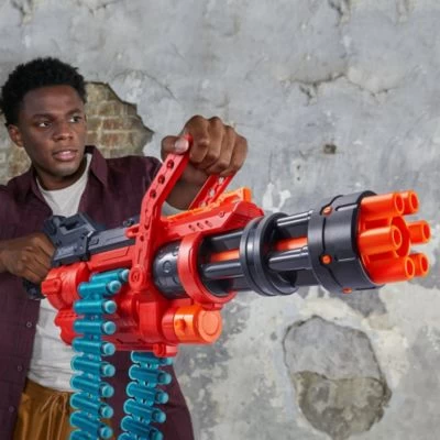 Federdruck BlasterSlamfire Modus für SchnellfeuerMinigun LookRotierender LaufMunitionskette für bis zu 30 DartsEntriegelbare Kette für einfaches Nachladen96 Darts inbegriffen